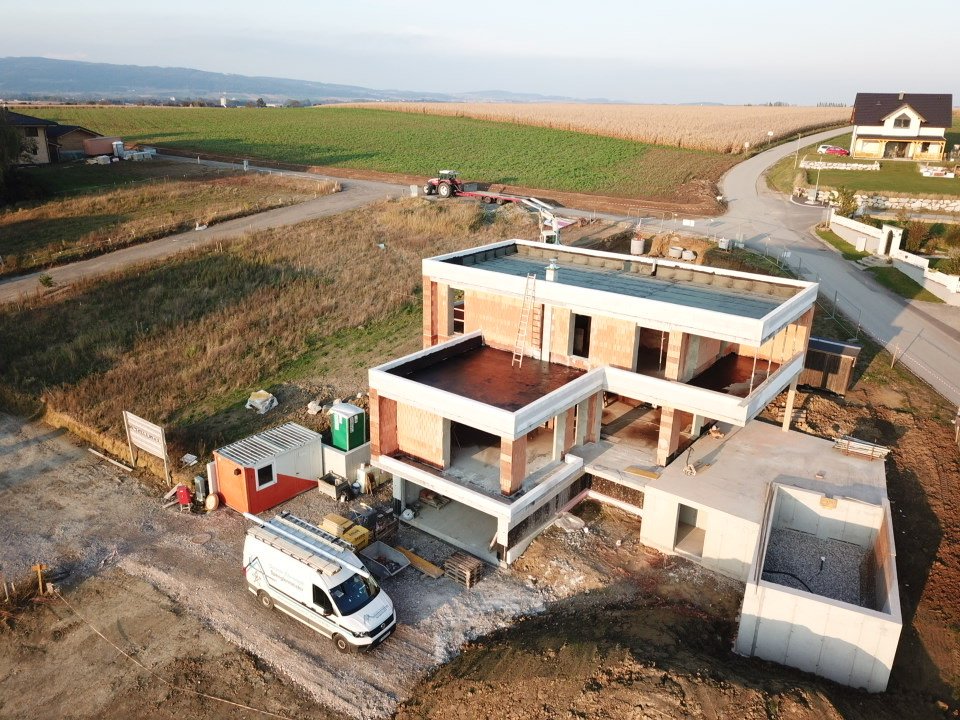 Errichtung eines Flachdaches mit EPDM Folie bei einem Neubau.